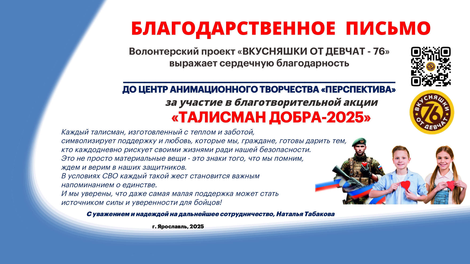 15 ноября завершилась благотворительная акция «Талисман добра», организаторами которой в Ярославле является волонтерское движение «Вкусняшки от девчат-76». Акция посвящена поддержке наших бойцов, принимающих участие в специальной военной операции.
